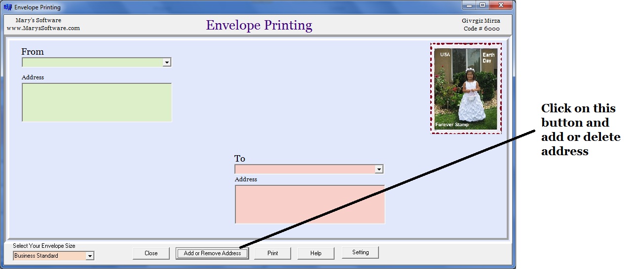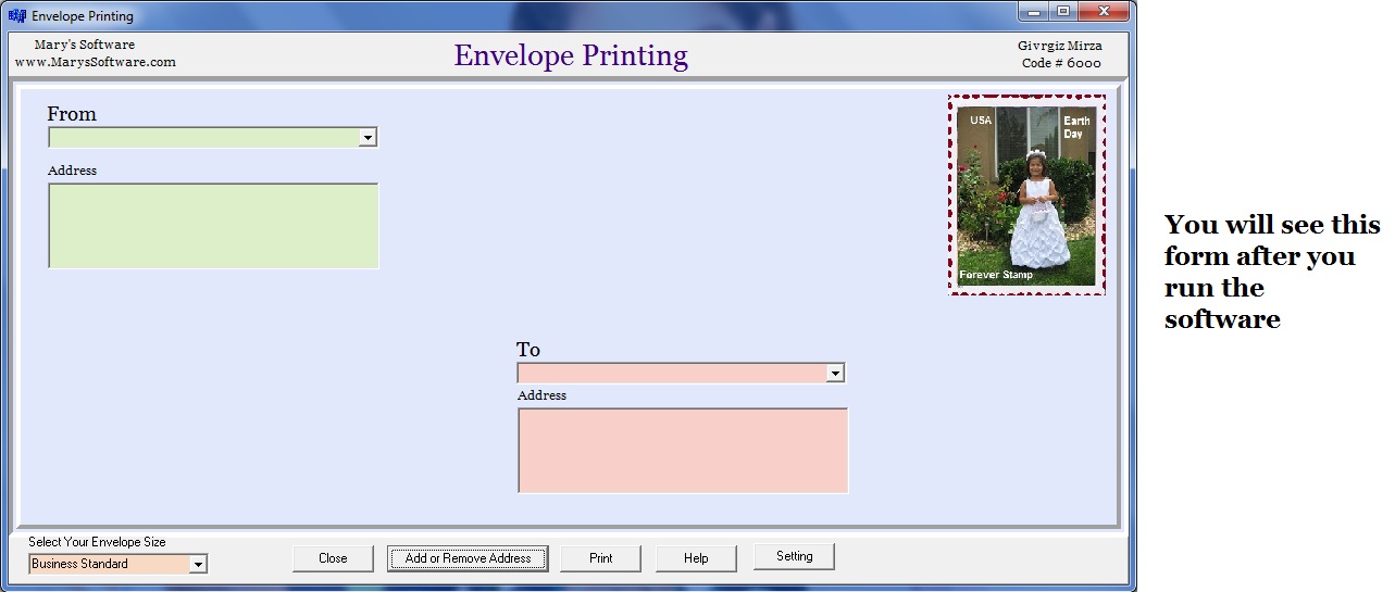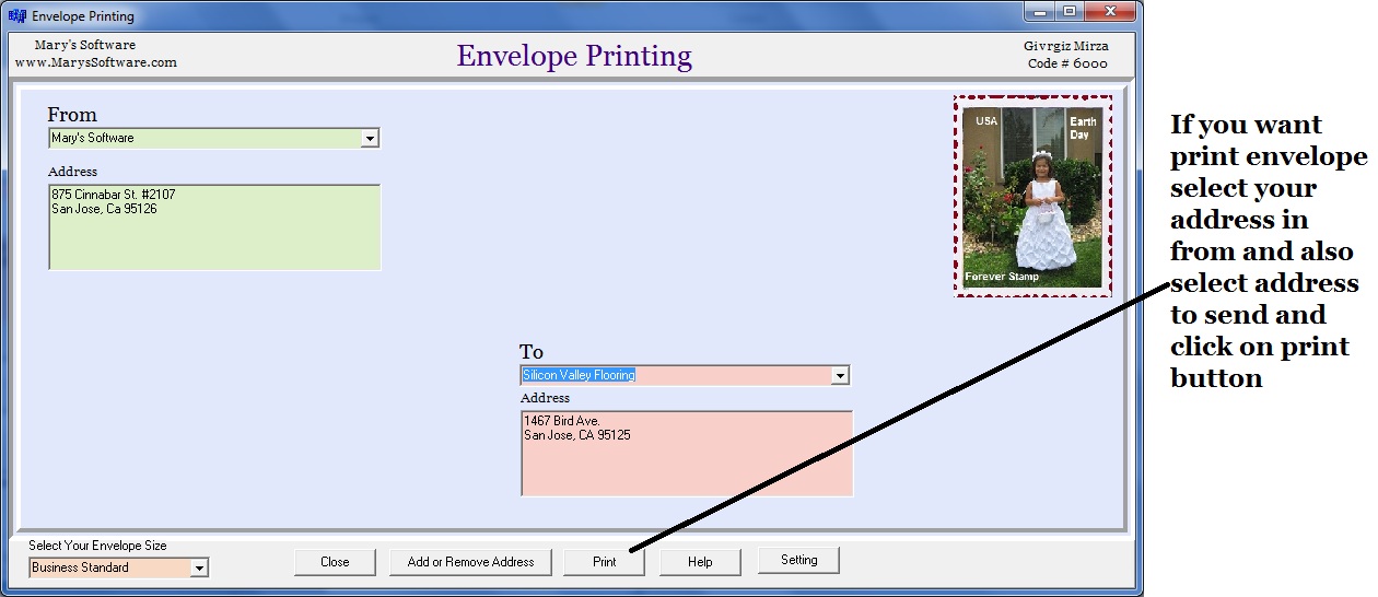 Envelope Printing Software makes printing your Envelopes. It save all of your sending addresses. It design for small busness. It is very easy software.
